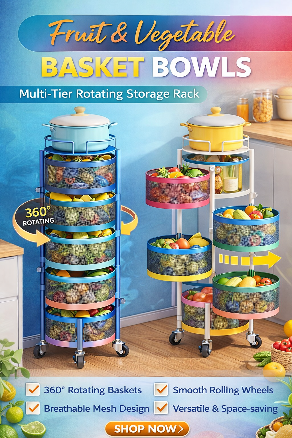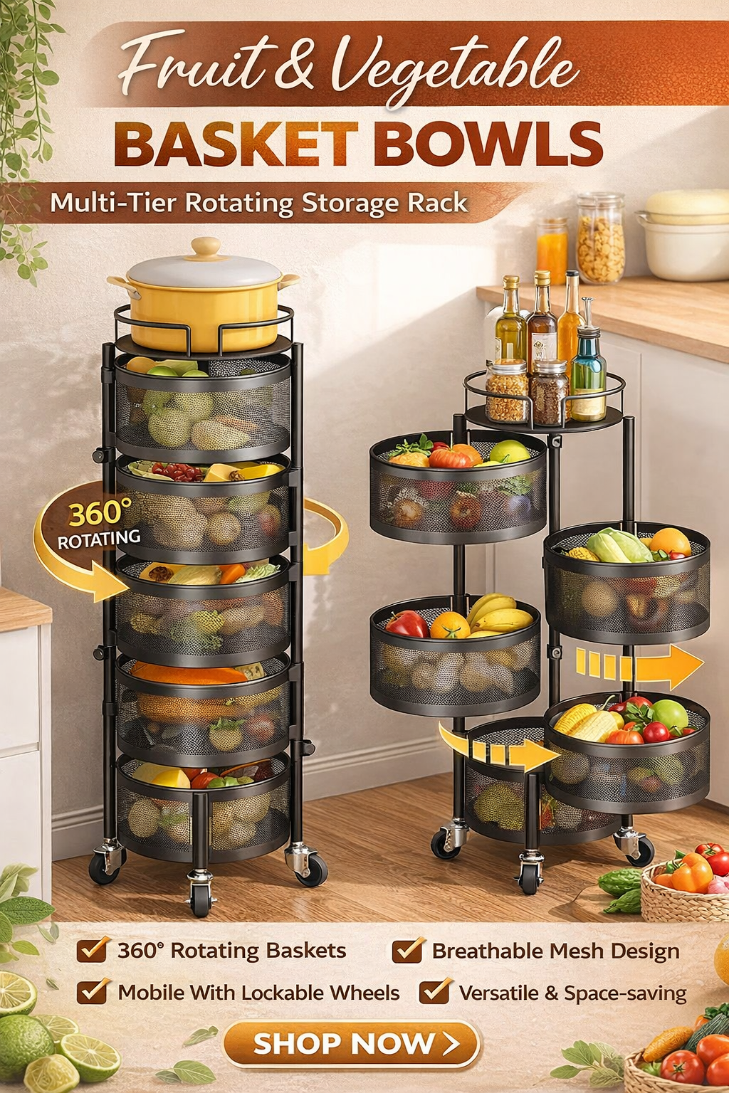 Rotating Basket Storage Rack – A multi‑tier, 360° rotating organizer with mesh baskets and rolling wheels, perfect for storing fruits, vegetables, snacks, toiletries, and household essentials in any room.